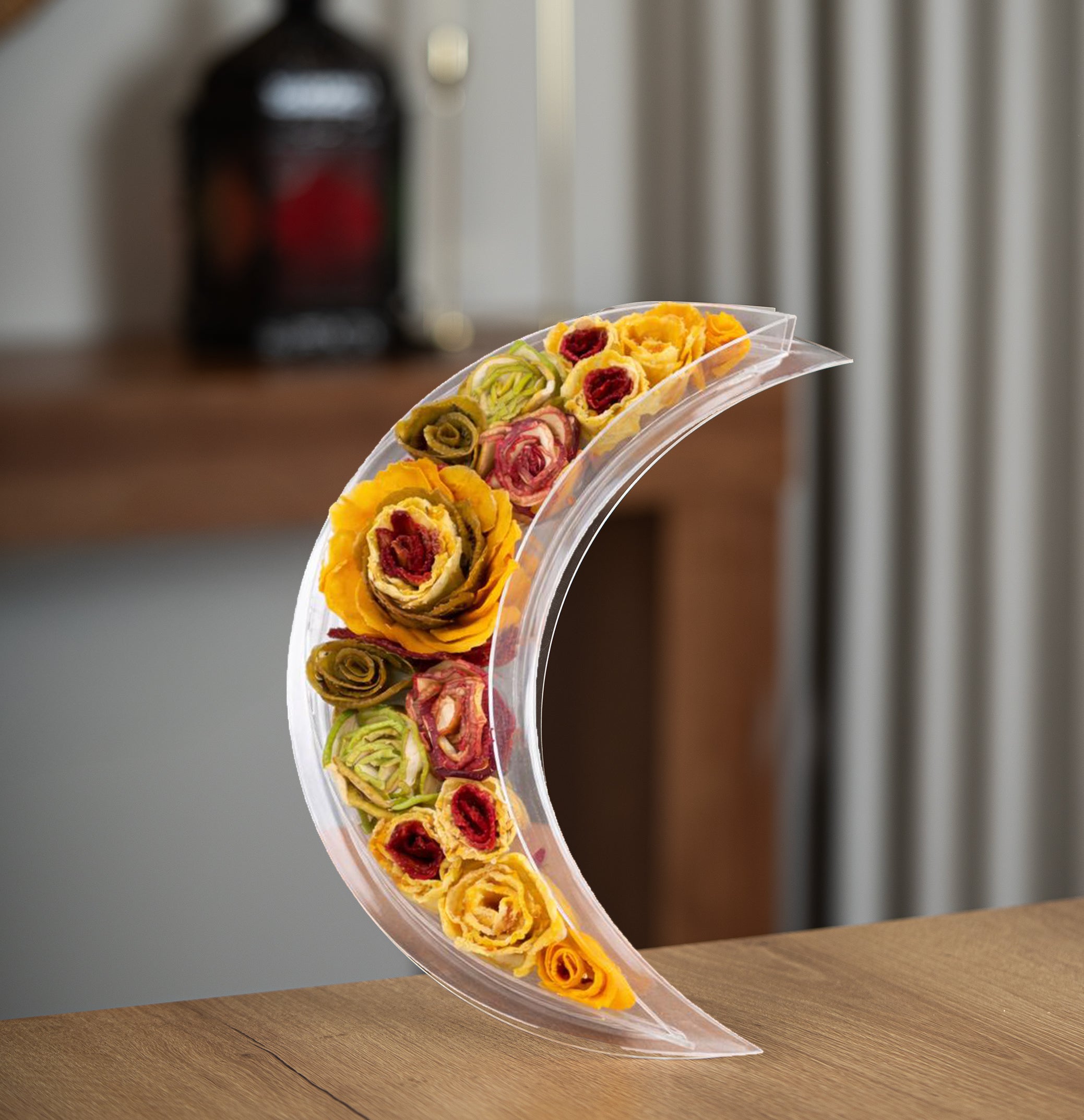 منتج أنيق مصمم على شكل هلال رمضان من الأكريلك الفاخر، ليكون خيارًا مثاليًا للإهداء في الشهر الكريم. يحتوي الهلال على تشكيلة مختارة بعناية من الفواكه المجففة الطبيعية 100% بدون إضافة سكر، بطعم غني ونكهات طبيعية تلائم جميع الأذواق.